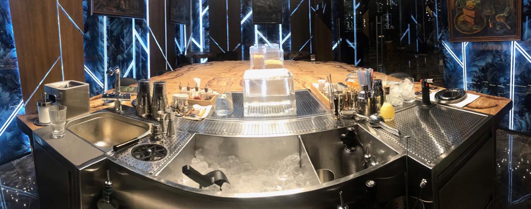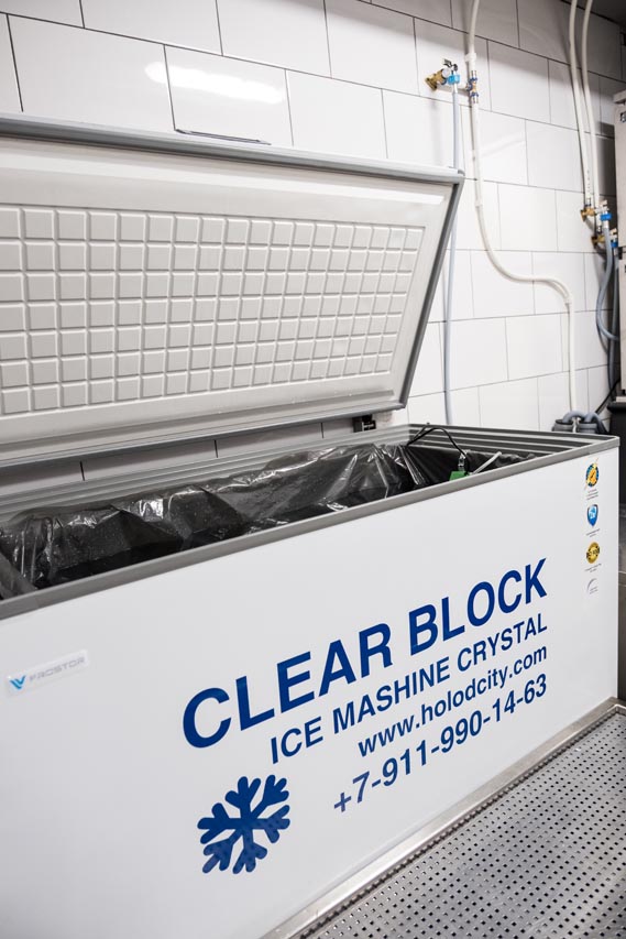 Вот на одном из выполненных нами проектов, в ресторане "Парк культуры" г. Нижний Новгород используется нестандартная подача напитков в Водка-баре. Специальное оборудование производит глыбу льда, которую устанавливают на специальный постамент на барной стойке перед посетителями.